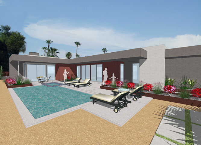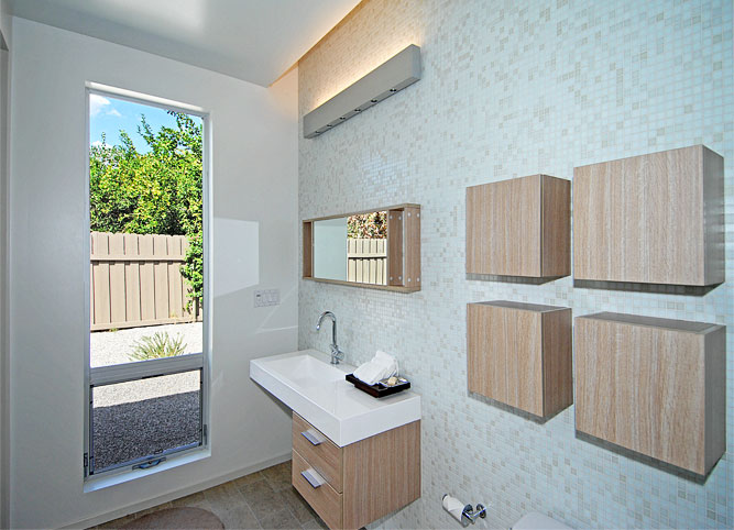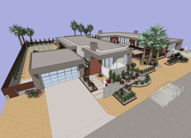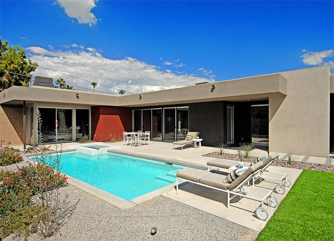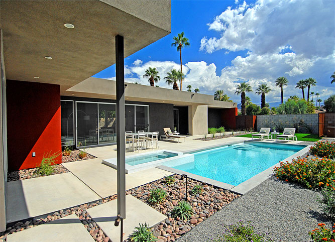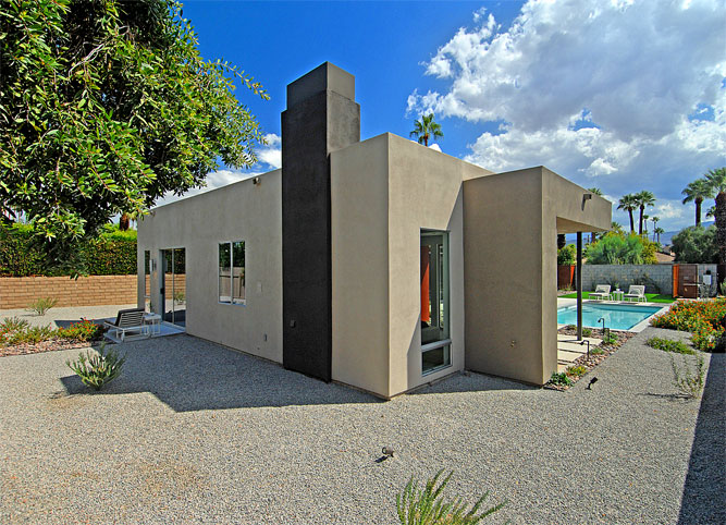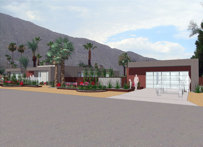 These two homes were a part of the prefab studies where the architect, developer and builder were one. The two factory-made wood-framed residences were composed of 2 bedrooms, an office and 2-1/2 baths. The amenities include a pool, a spa, indoor fireplaces and outdoor showers. The additional optional Casitas were to include an additional bedroom and full bath.