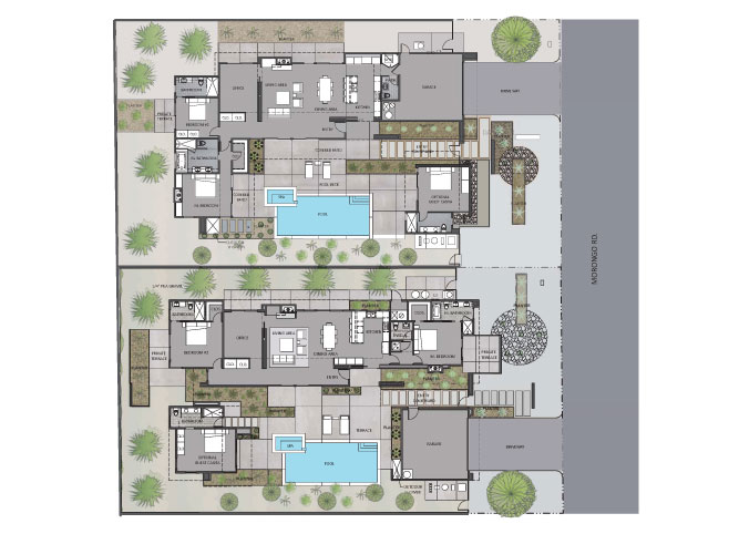 The two secluded modern homes reflect the nature and character of Palm Springs. Much like the city, these residences offer a tranquil space to rest the mind, body and spirit. Yet in the blink of an eye, the homes can quickly transition into an urban space meant for indoor and outdoor entertaining. w/ ojmr architects.